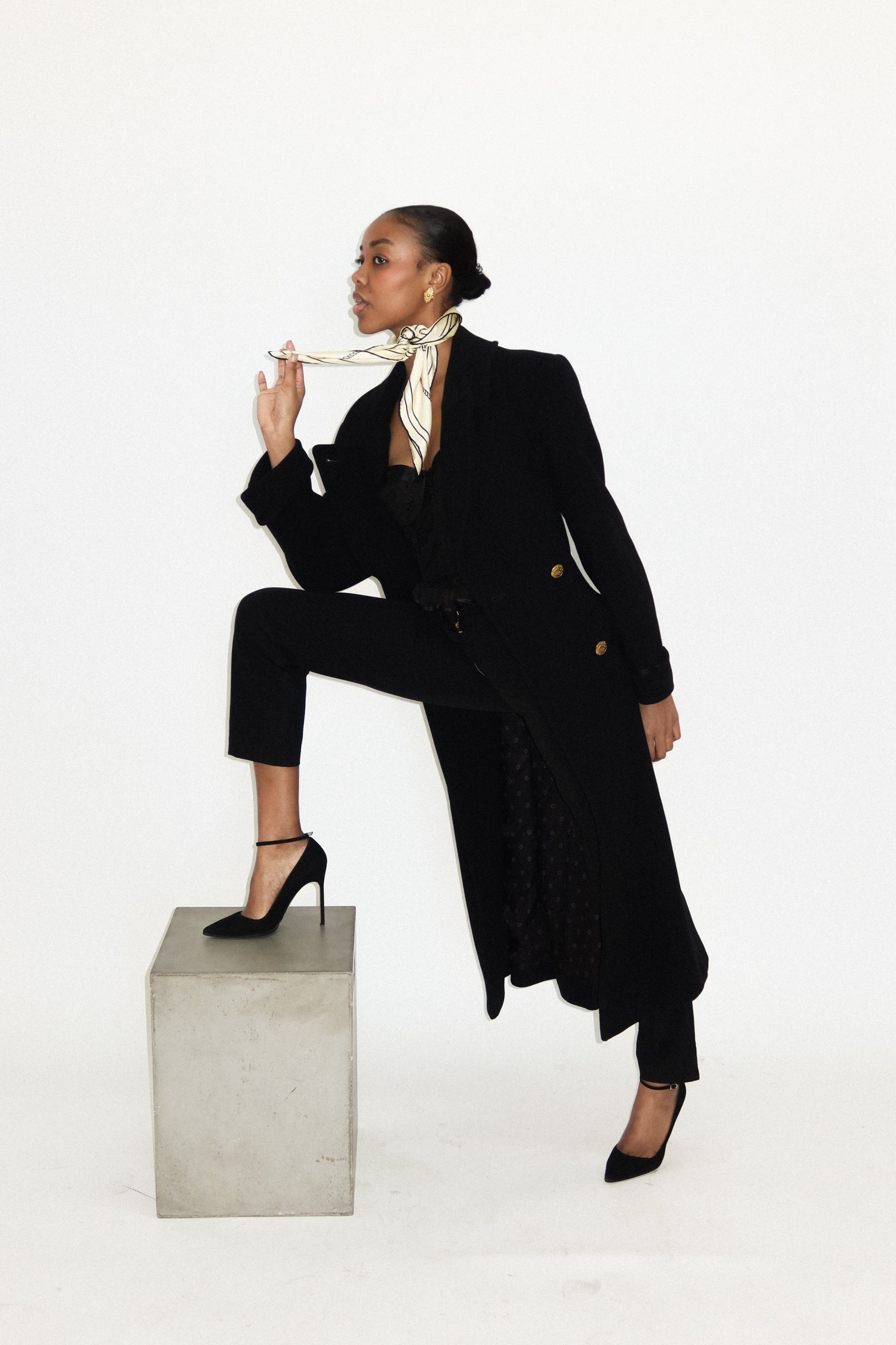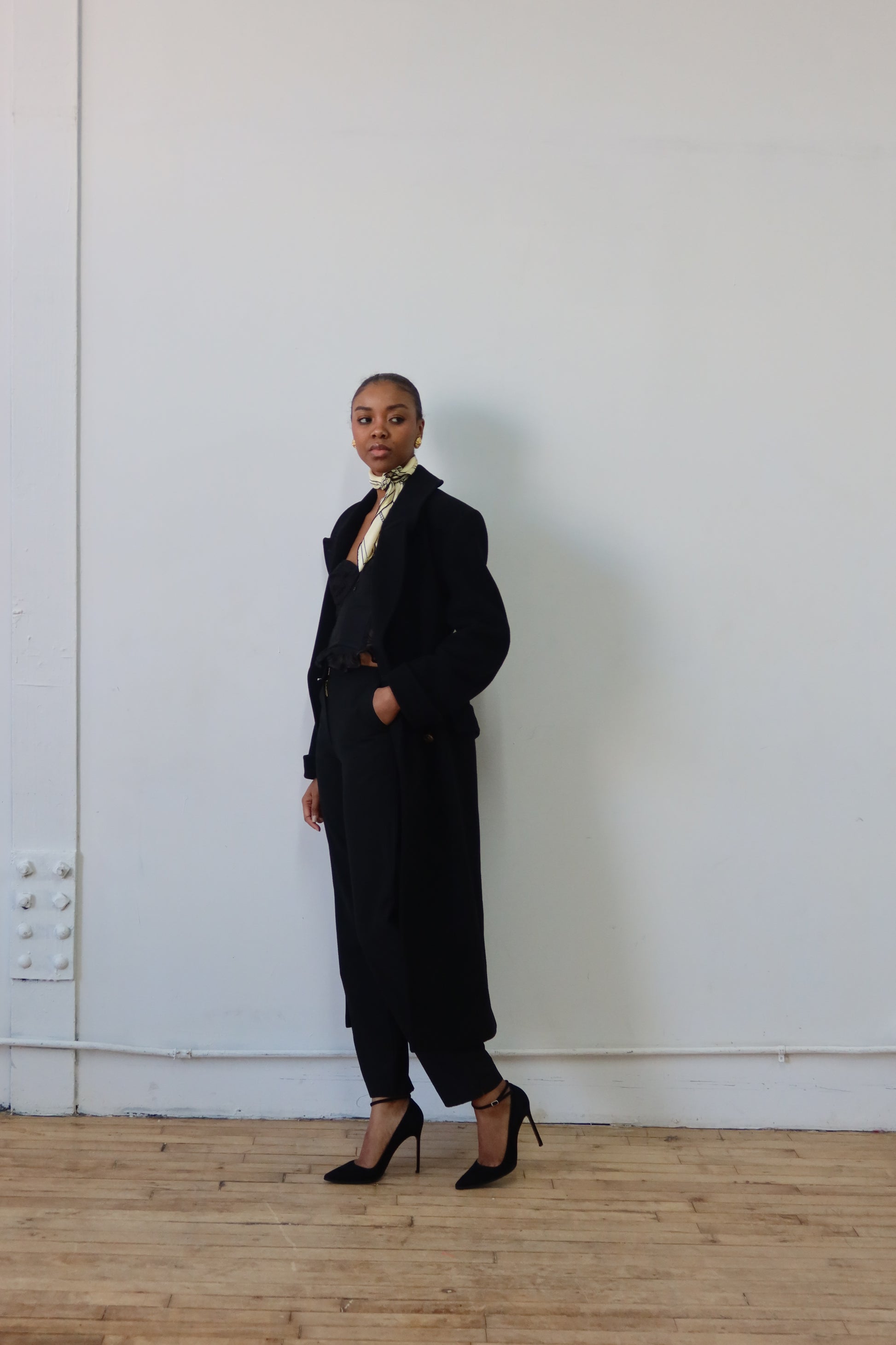 - Black wool double breasted trench coat