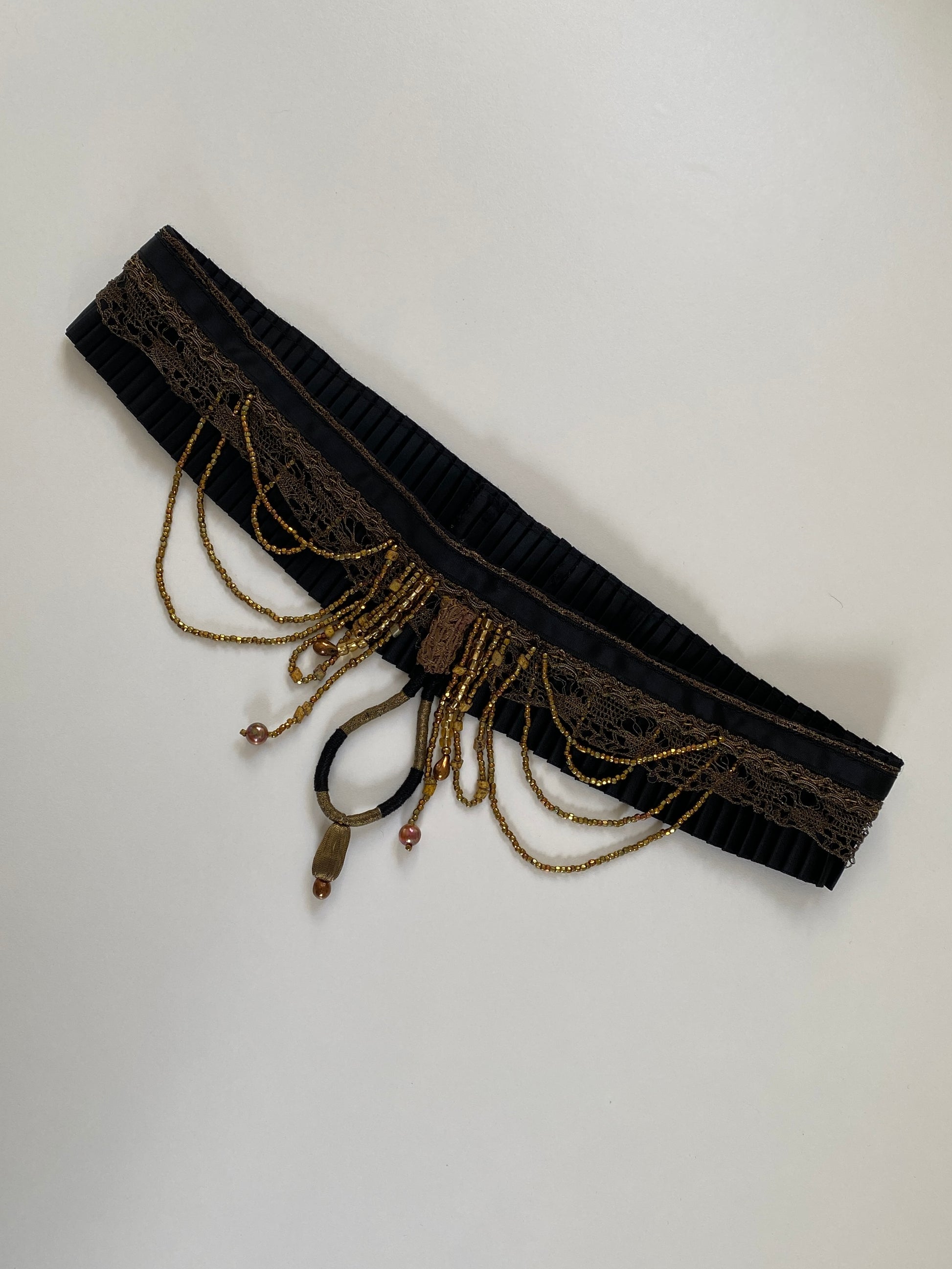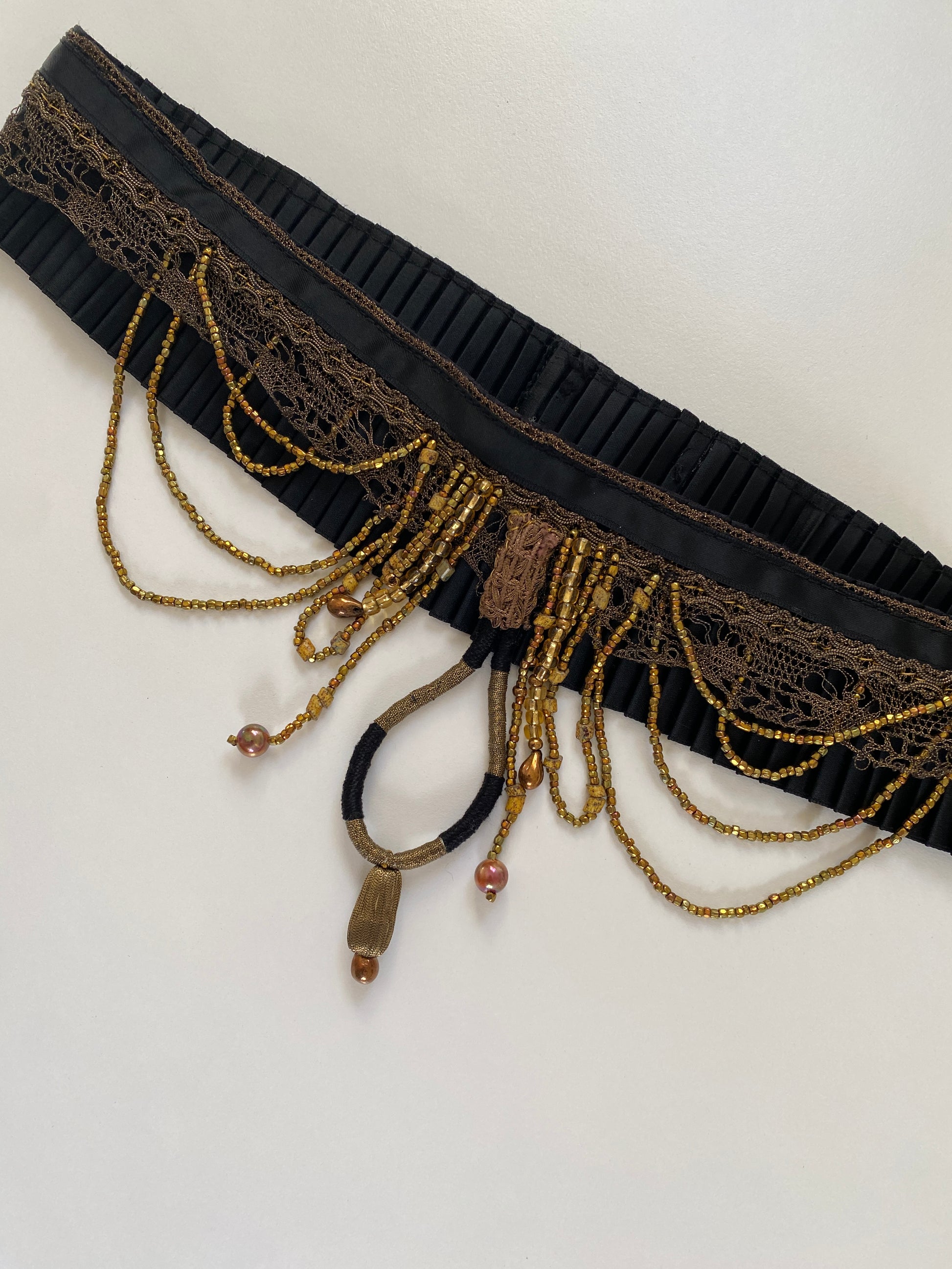 - Black pleated satin with gold beaded detail